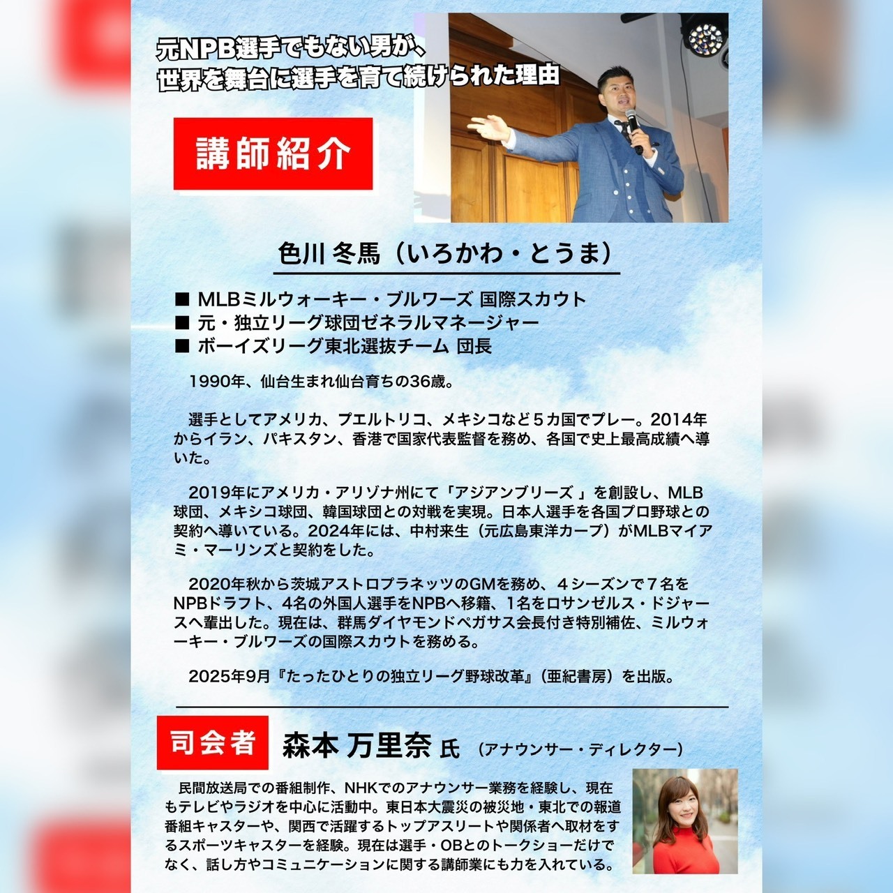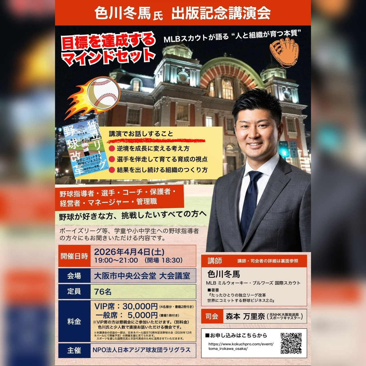 NineForce運営母体であるNPO法人「日本アジア球友団ラリグラス」主催で講演会を開催します。講演者は元独立リーグ茨城アストロプラネッツGMで、現大リーグミルウォーキー・ブルワーズ国際スカウトの色川冬馬氏!この度、自身のこれまでの事業、経験などを著した書籍を出版しました。
