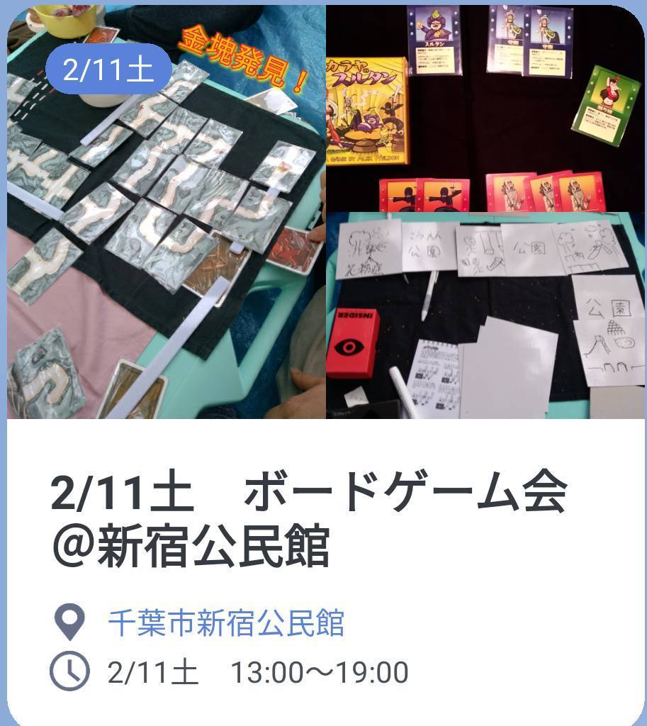 2/11土と2/19日に千葉市新宿公民館でボードゲーム会を開催します!