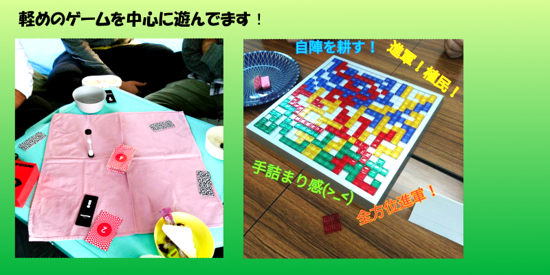 初心者歓迎、軽めのゲーム中心で勝ち負け気にせず気楽にボードゲームを楽しむ!って感じで活動してます♪