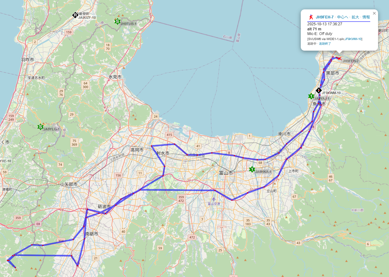 10月13日は射水市、金沢市と移動したのでハンディ機に外部アンテナを使ったところデータが出てました。