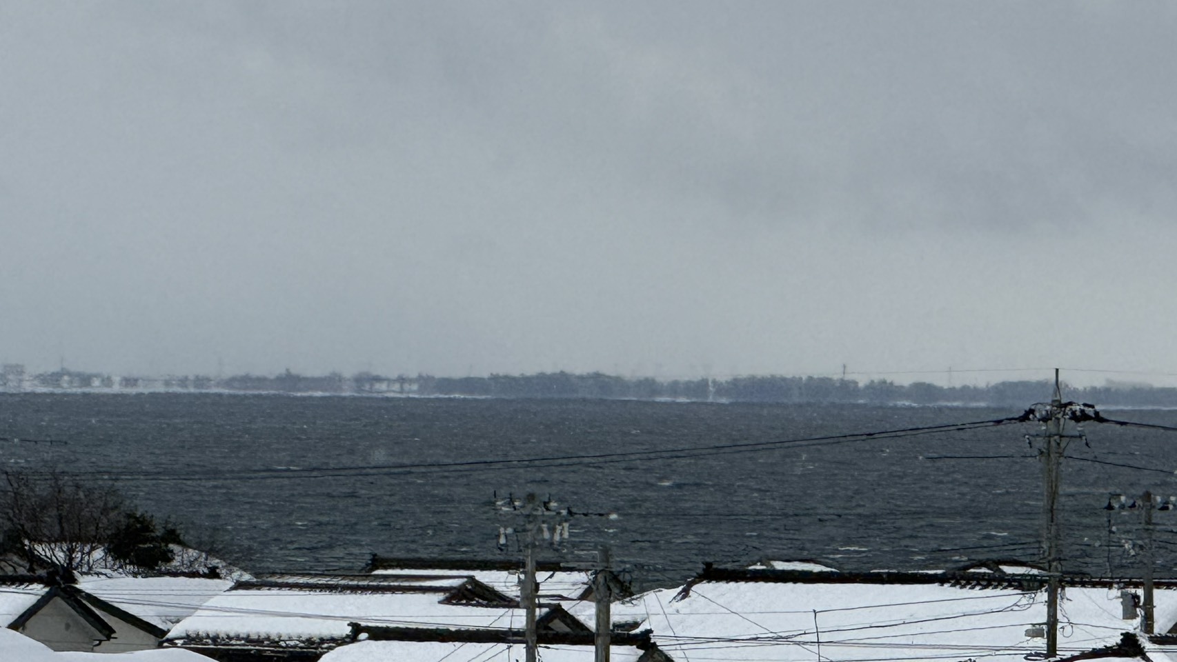 公民館屋上から富山市、射水市側を眺めると、冬型蜃気楼で市街が浮かんで見えました。