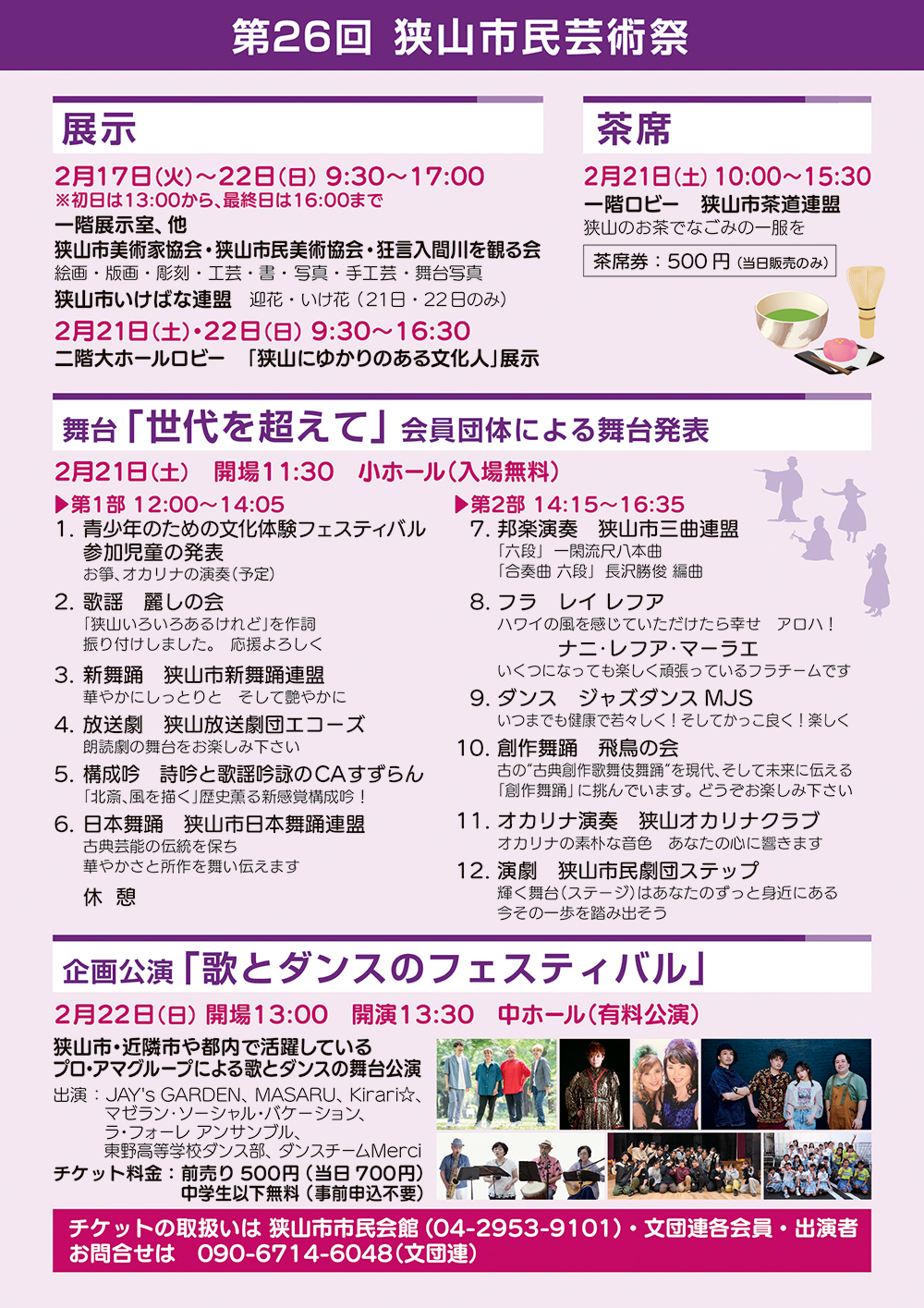 チケットは狭山市市民会館(04-2953-9101)・文団連各団体・出演者へ