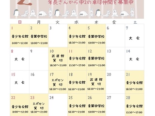 練習時間 月曜日 19時〜21時 水曜日 18時半〜21時 木曜日 19時〜21時 土曜日 13時半〜17時 日曜日 9時〜12時 ※練習会場はお問合せください ※活動報告に練習予定表を掲載しました
