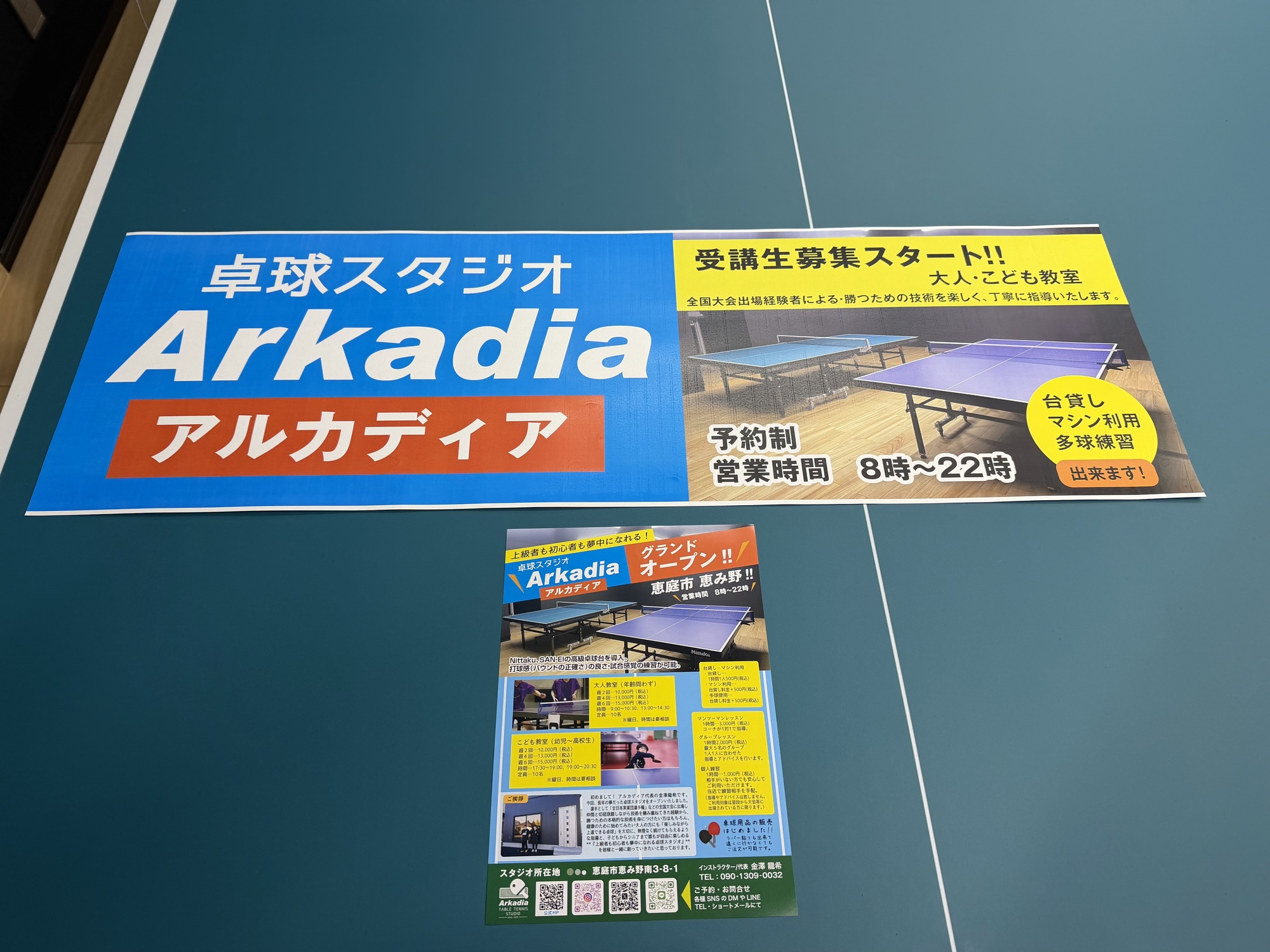この度スポンサーさんが卓球スタジオアルカディアのチラシと簡易的な看板を作成してくれました!