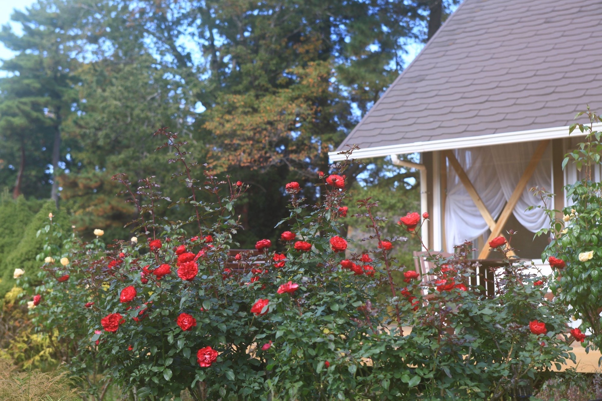 ちょうど秋バラのシーズンでここもバラ園があります。もみじの木もありますし紅葉も楽しめるかなって