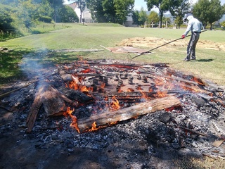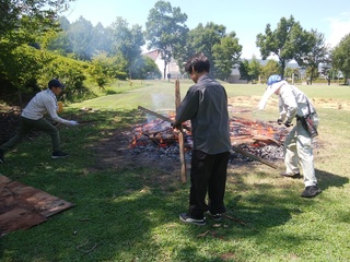 古墳下の芝生広場で、HSCの中学生たちが、学芸員さんやシルバーのおじさんたちの力を借りて、はにわを野焼きしていました。
