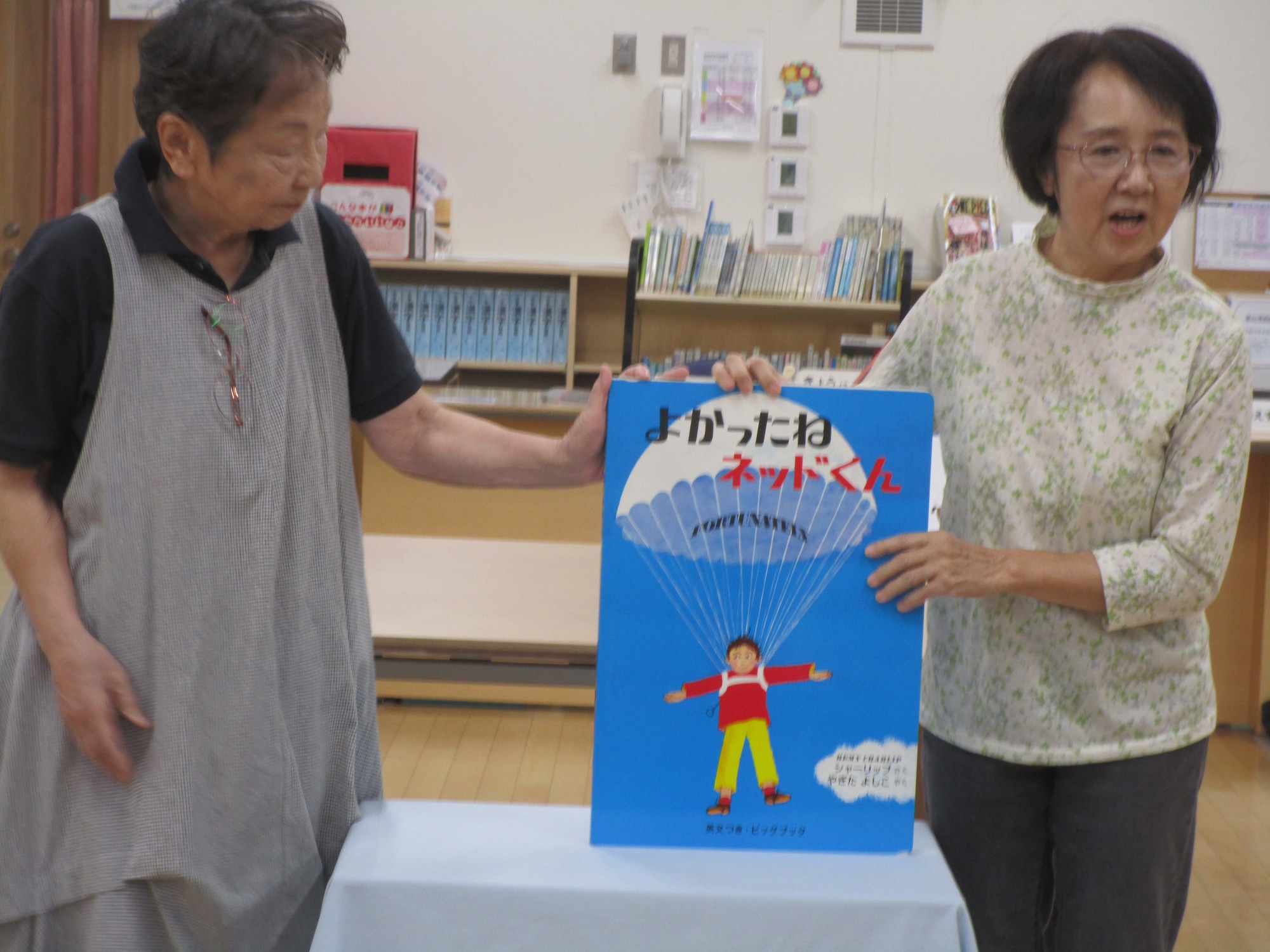 読む人は普通のサイズの本、見る人は大型本でよく見えたそうです