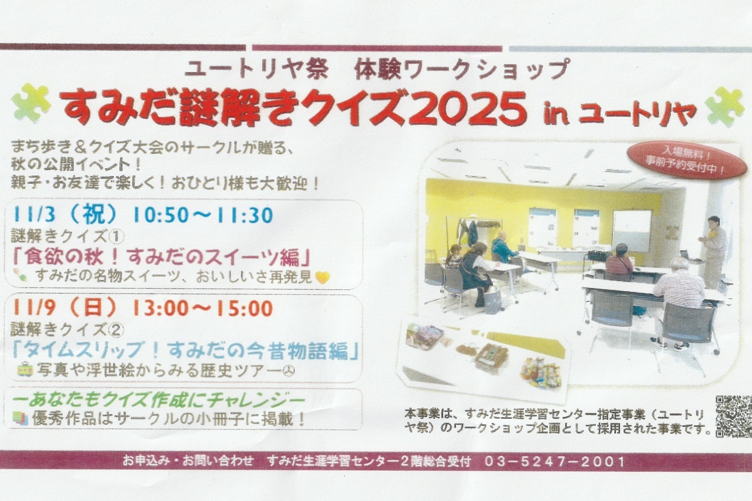 11月3日(月・祝)に行われた第一弾では、墨田区の名物スイーツに関するクイズが出題されました。知っているようで知らなかったお店の歴史や、スイーツに隠されたこだわりに触れることができ、甘いものが好きな参加者の皆さんと一緒に盛り上がりました!