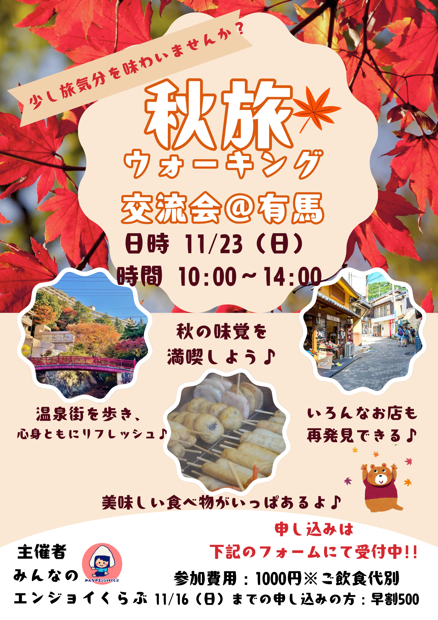 今回、「秋旅 ウォーキング交流会@有馬」のイベントでは紅葉を見ながら、参加者様と交流を楽しむこと、また、適度な運動を通して健康維持や気分転換をすると言った目的なります✨️✨️