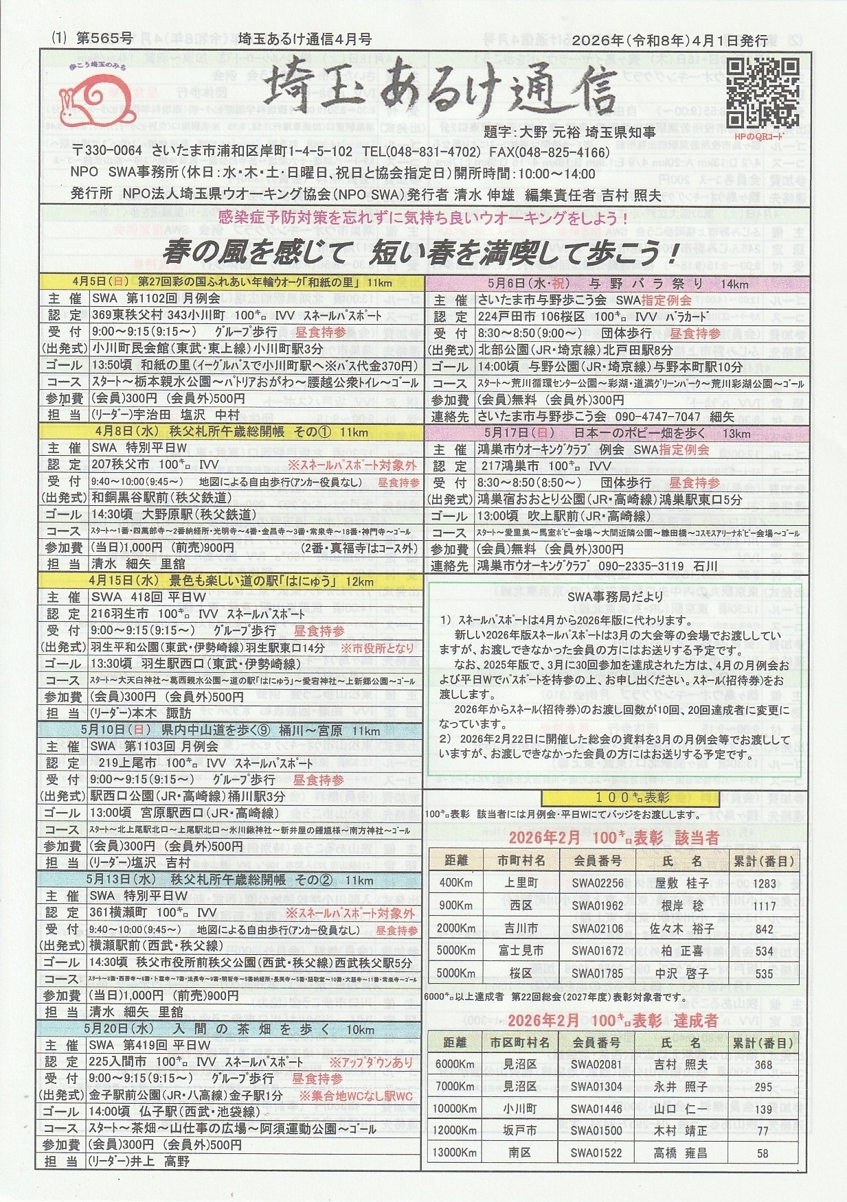 | コミュニティ名 | NPO法人埼玉県ウオーキング協会(SWA) |