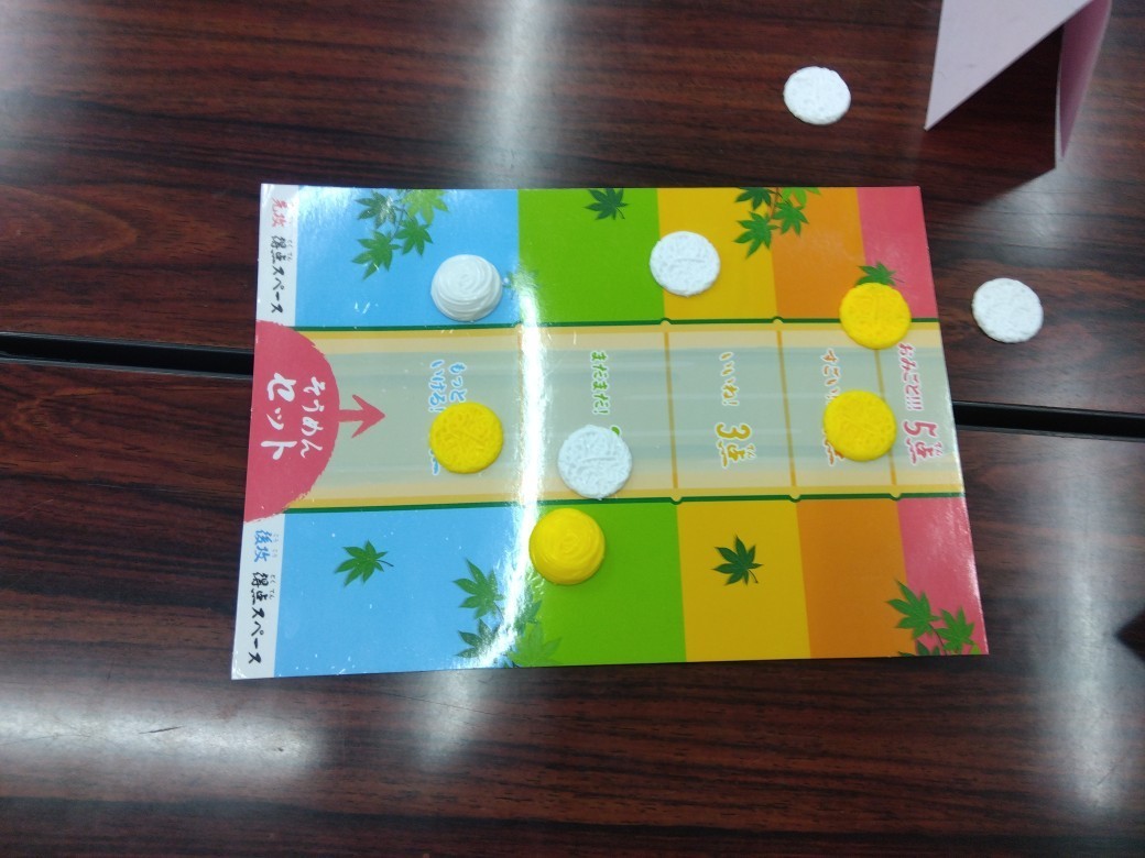 そうめんにみたてたおはじきを弾いて、止まったところの得点を獲得できるゲーム。弱く弾きすぎて飛ばなかったり、力を入れすぎてはみ出てしまったり、調整が難しいゲームでした。