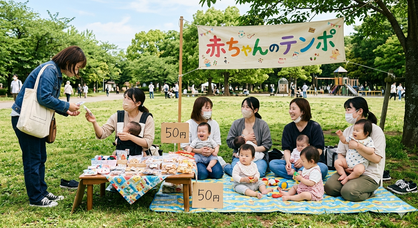 都内で1,2歳までのお子さんと一緒に公園などの片隅でフリマを開くお店です。何組か合同で1店舗、途中参加、退出OK、お互いにサポートしながらお店を運営します。