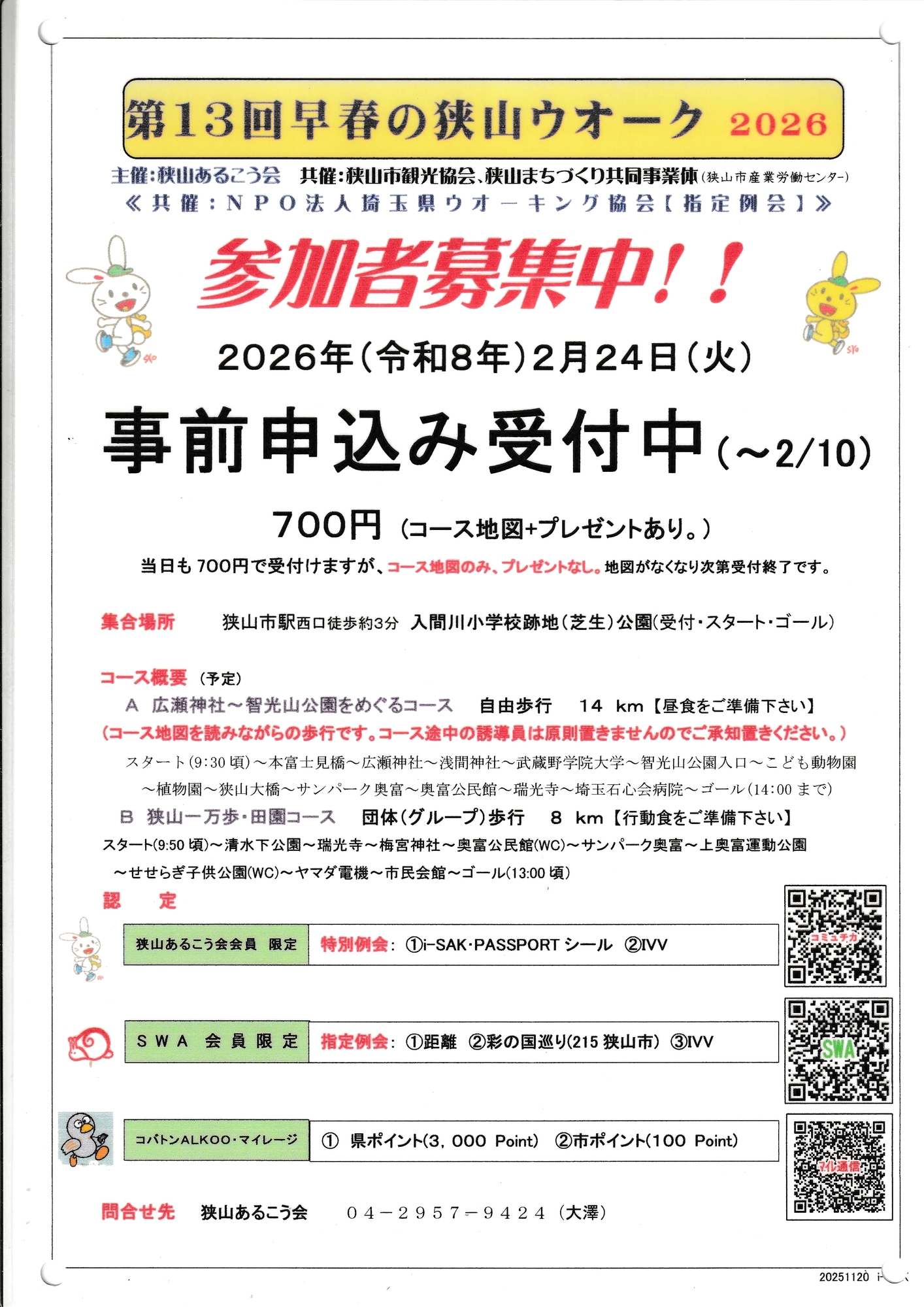 連絡先:狭山あるこう会 TEL:04-2957-9424 大澤