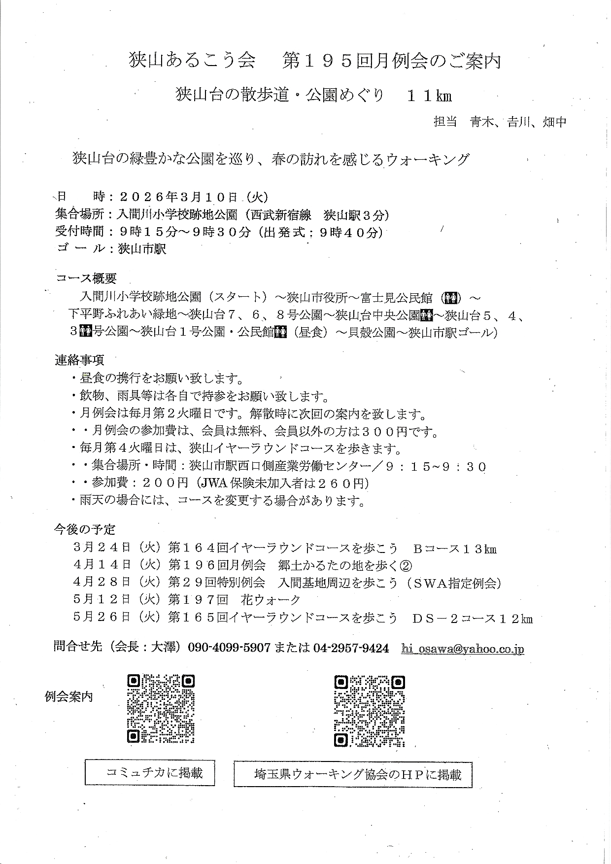 連絡先:狭山あるこう会 TEL:04-2957-9424 大澤